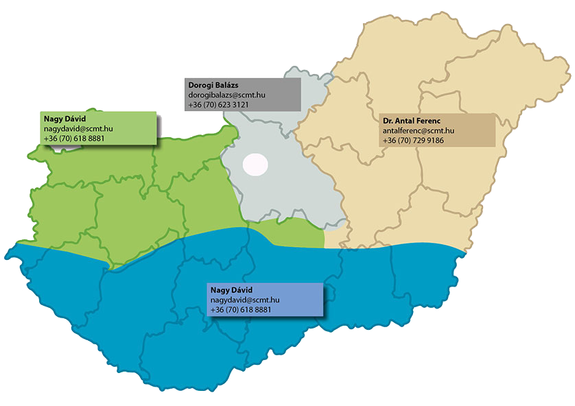 Területi képviselőink területi vezető Dorogi Balázs +36 70 623 3121 dorogibalazs@scmt.hu területi képviselő Dr. Antal Ferenc Ph.D. +36 70 729 9186antalferenc@scmt.hu Területi felosztás